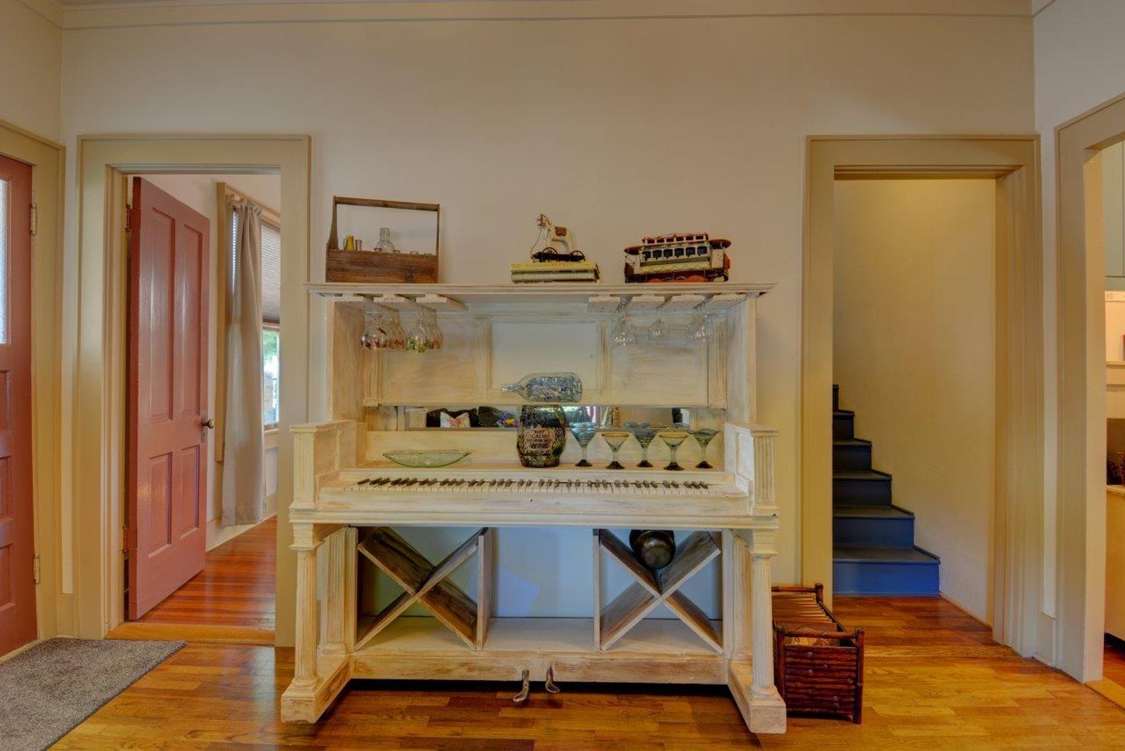 Visit the town’s local cafes or the gourmet kitchen has everything you need and more, complete with plenty of dishes, pots and pans, blender, coffee maker (with the coffee), and even an air pop popcorn maker complete with organic popcorn. Enjoy the whimsical piano bar and our display of antiquities and curiosities found on the property. Relax a little and take a bath in the large clawfoot soaking tub…